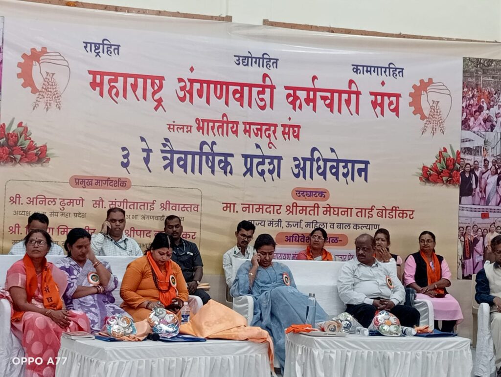 दिनांक 22 मार्च 2025 वार रविवार रोजी महाराष्ट्र अंगणवाडी कर्मचारी संघाचे ३ रे त्रैवार्षिक अधिवेशन लक्ष्मी नारायण मंगल सभागृह,मंगळवार पेठ, सातारा येथे संपन्न झाले. मा.नामदार सौ.मेघनाताई बोर्डीकर राज्य मंत्री ऊर्जा, महिला व बालविकास यांची प्रमुख उपस्थिती होती. संगीता श्रीवास्तव अखिल भारतीय अंगणवाडी सचिव यांचे प्रमुख मार्गदर्शन झाले. या अधिवेशनामध्ये अंगणवाडी